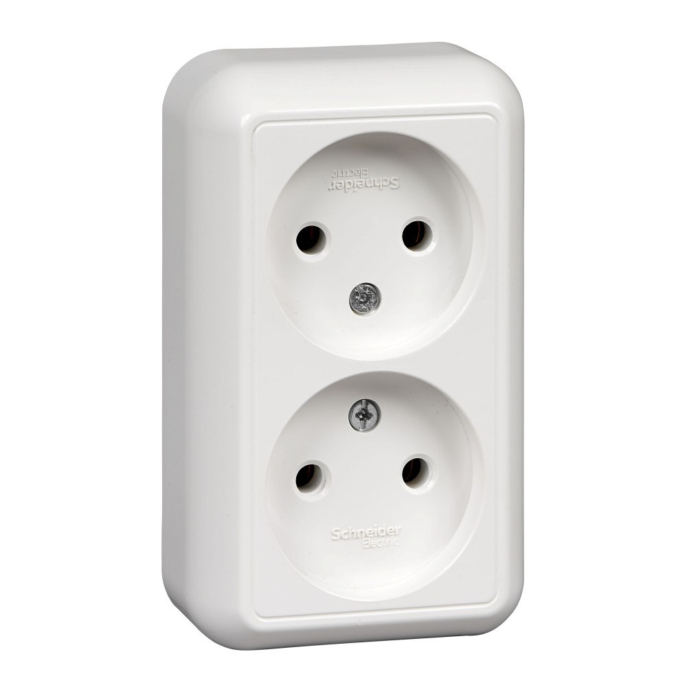 Розетка двойная Schneider Electric ПРИМА (открытой установки, цвет белый) без заземления и без шторок, с изолирующей пластиковой пластиной предназначена для сетей до 250 В на ток до 16 А.